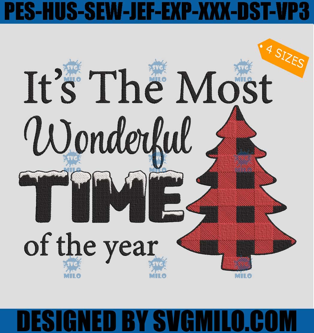 It's The Most Wonderful Time Christmas Embroidery Design, Red Buffalo Tree Xmas Embroidery Design